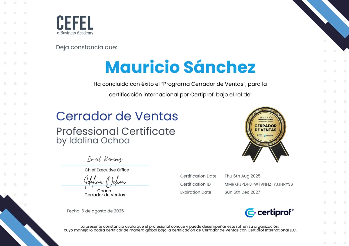 Desarrollar una mentalidad sólida, enfocada y resiliente que te permita asumir el rol de un cerrador profesional. Aprenderás a construir tu identidad de cierre, dominar tu energía y elevar tu propósito de venta para conectar con confianza y claridad.